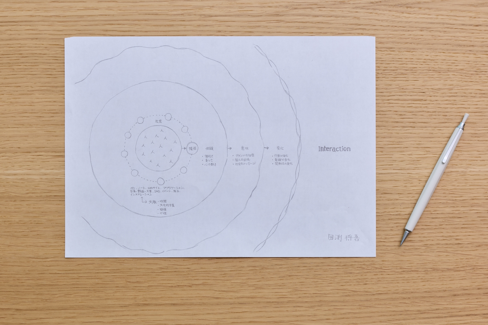つまり、インタラクションとは人の心の揺らぎがきっかけとなり、その影響が社会へと広がっていく波紋のような現象だと考えています。小さな感情の揺らぎが連鎖し、やがて文化や社会の姿を形づくっていく──その過程をデザインで支えていきたいと思っています。
