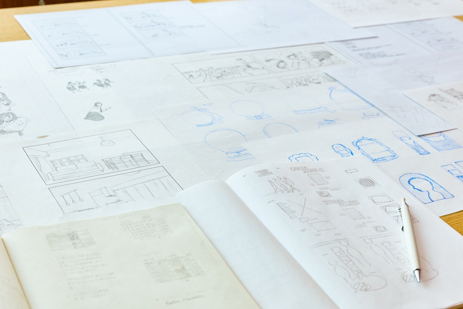 作業としては、デジタル領域のデザイナーなので意外と思われるかもしれませんが、頭の中に浮かんだ具体化したいアイデアを、まずは絵コンテやラフ画を紙にたくさん描くところから始めます。
